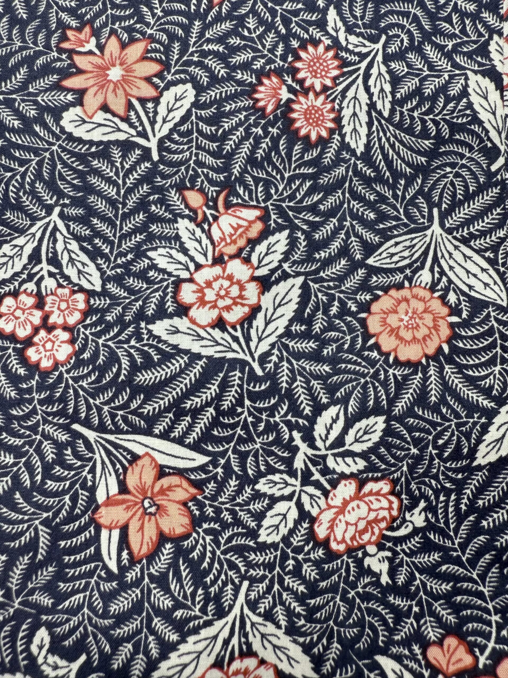 Chemise à motif floral écru et rose sur fond bleu acier – coton doux, broderie marine « Même le diable me trouve méchant », coupe ajustée. Numérotation unique