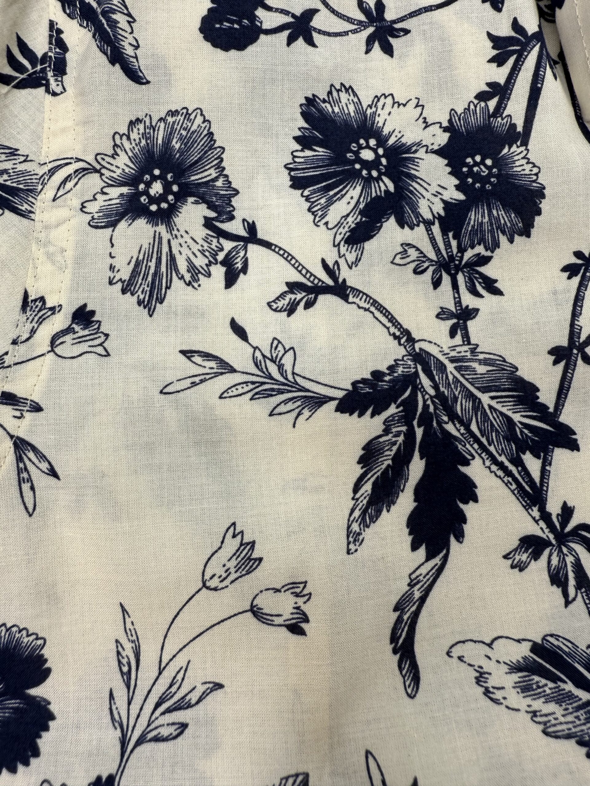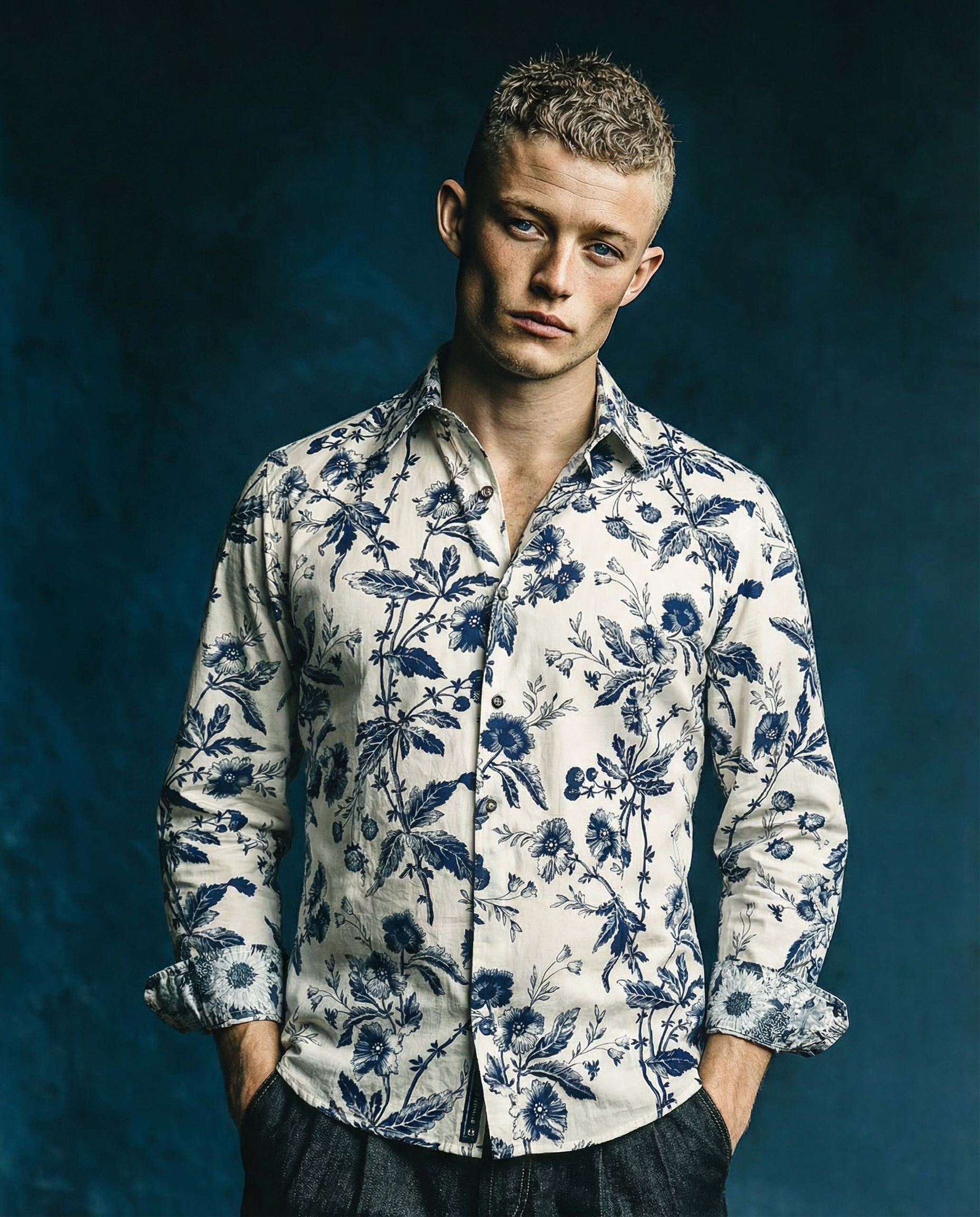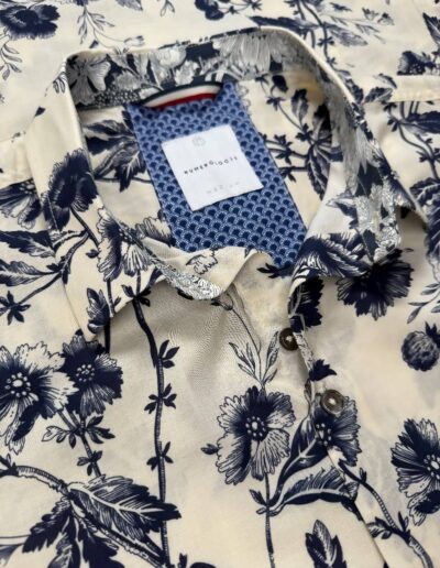Une chemise à motif floral délicat bleu sur un fond beige, pensée pour un style qui allie confort et sophistication.